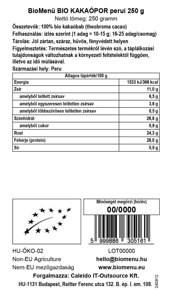 Organic Cacao Powder (Peru) is 100% natural and does not contain any additives such as sugars, acids, colorants, preservatives, etc.