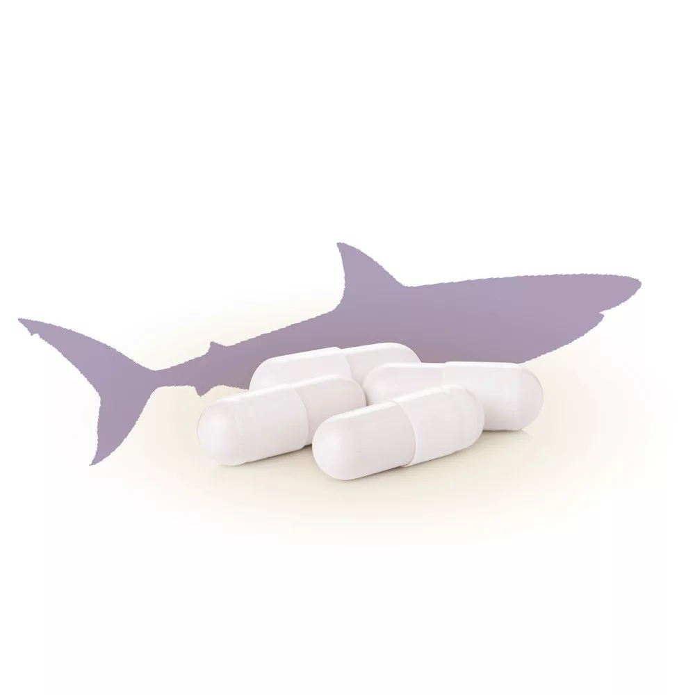 shark cartilage, anticaking (silicon dioxide and magnesium stearate). Coverage: gelatin; Allergens: contains fish and sulphites